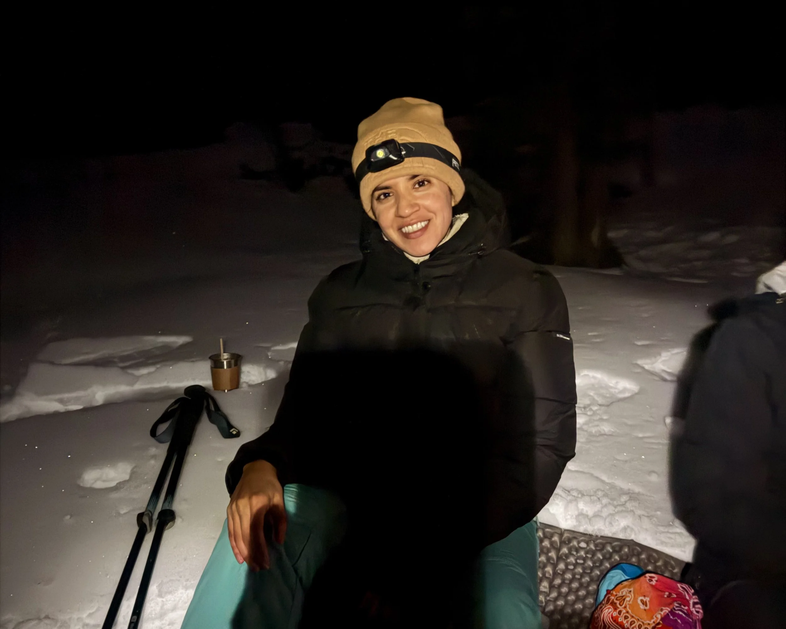 They provided snowshoes, poles, and headlamps as it was already very dark at 5 pm in January. We had two guides that lead the excursion and were very knowledgeable and attentive to every guest. The trail we did was around 3.5 miles and was rather easy. There was only one small portion where it was a bit of a steep uphill but wasn’t very long.