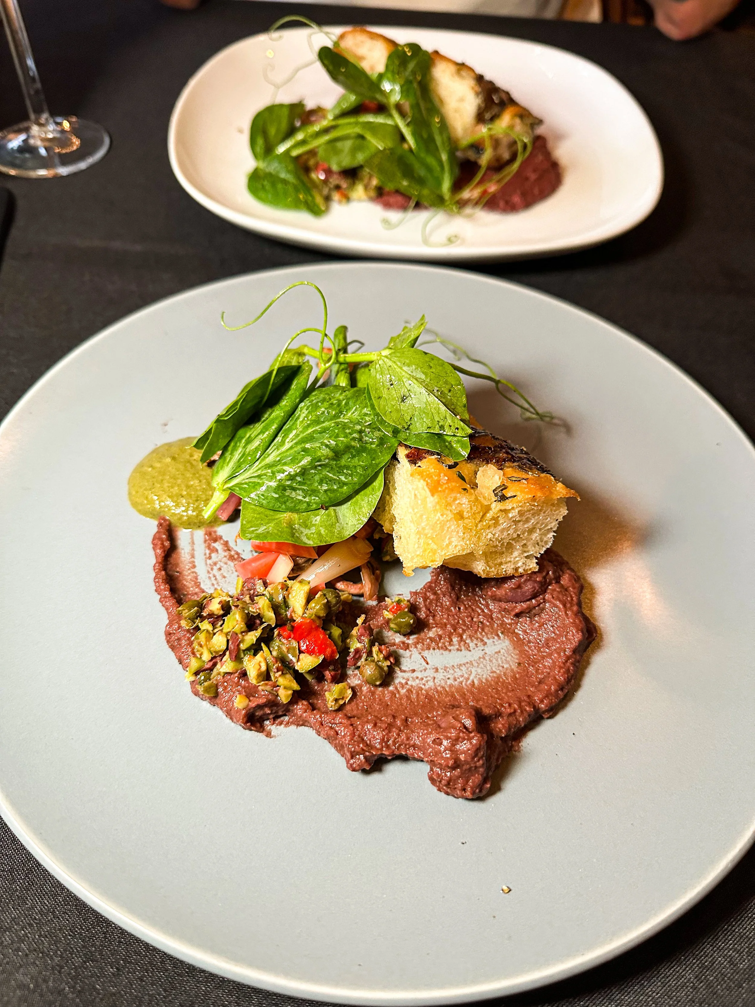 Our dishes were taken and the next course was served. This next dish to me was just like bread with dips, but beautifully plated. It came with freshly made focaccia along with roasted purple carrot and beet hummus. There was a dollop of carrot top pesto and some house pickled vegetables. As much as I enjoyed this dish, I could’ve just eaten the carrot top pesto and focaccia. Those were the true winners for me on the plate.
