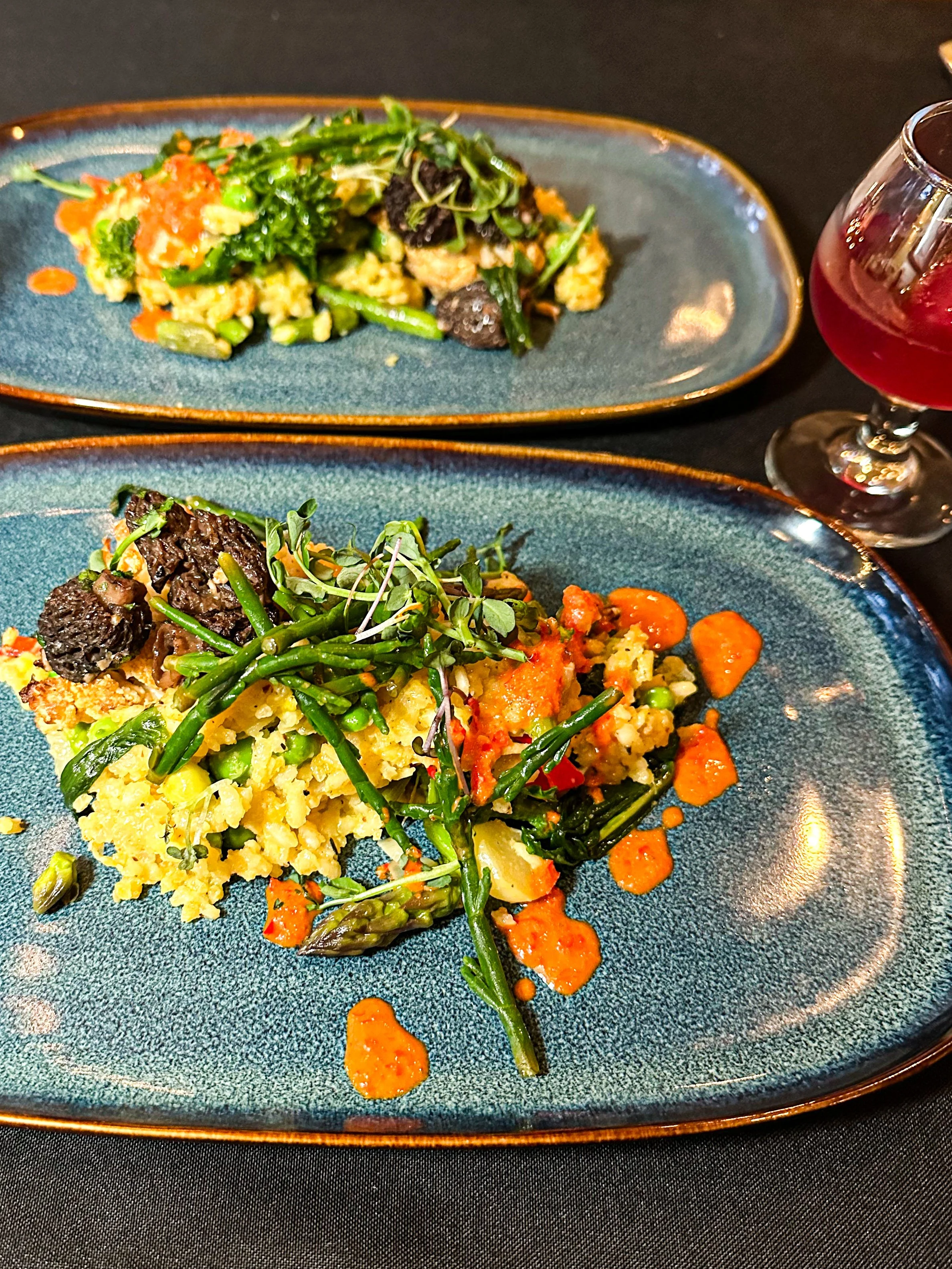 The fourth course was interesting. It was an herbed garlic roasted mushroom paella. It had spring vegetables, apple wood smoked cauliflower, and Fresno pepper coulis. I say this was interesting because I’ve never had a paella like this and I’ve lived in Spain, twice.