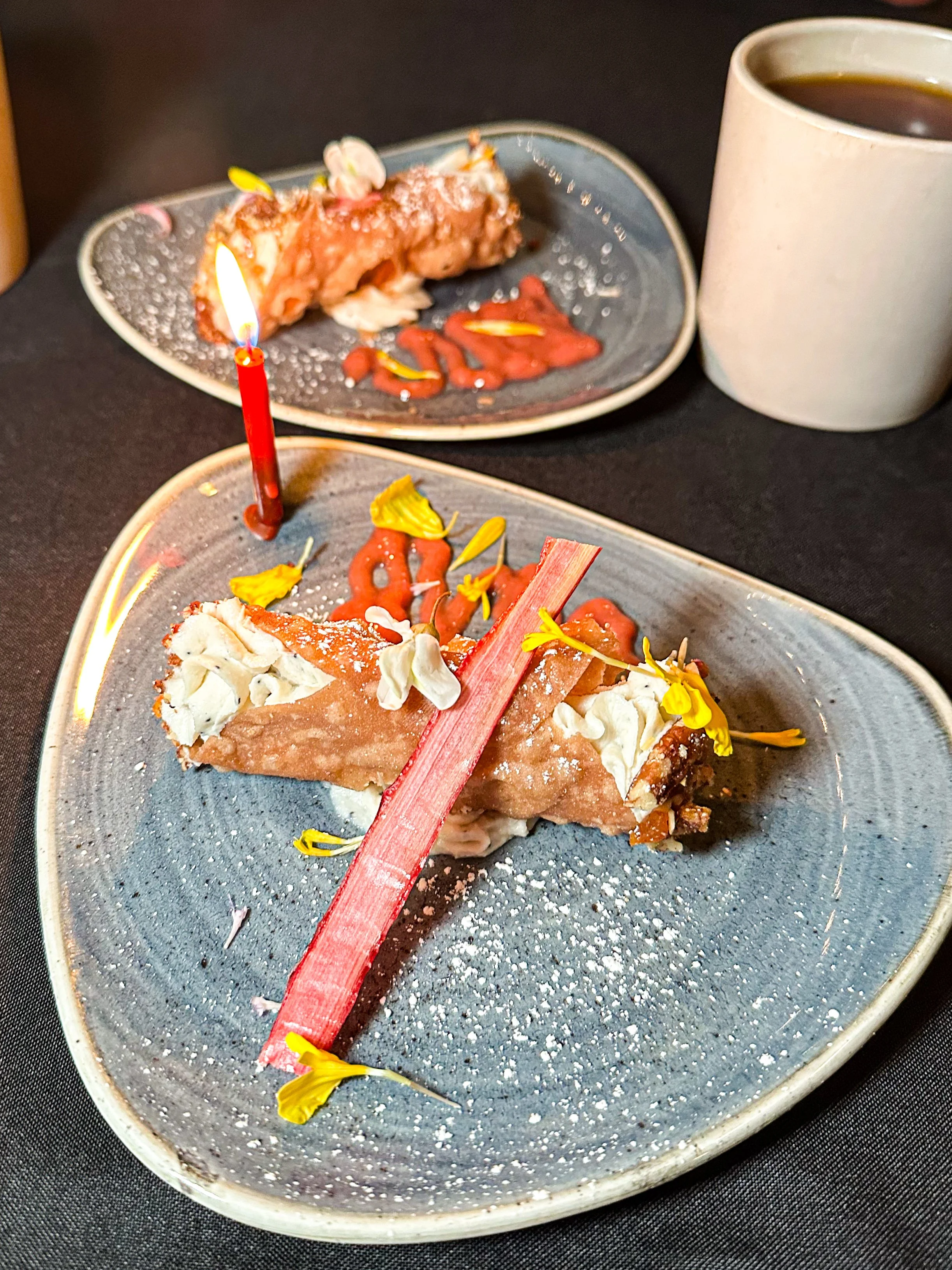 As someone who’s had a cannoli on the east coast, this cannoli didn’t have that nice crunch that I’d expect from a cannoli. I’m also not the biggest cream filled dessert type of person. So if I’m going to get a cream-filled dessert, it really has to have that wow factor for me. But this one, it was ok. What made it special though is that they brought out my dessert with a lit candle to help celebrate, which I greatly appreciated. The rooibos peppermint lemongrass ginger tea that came with it was also a nice touch left me feeling quite satiated.